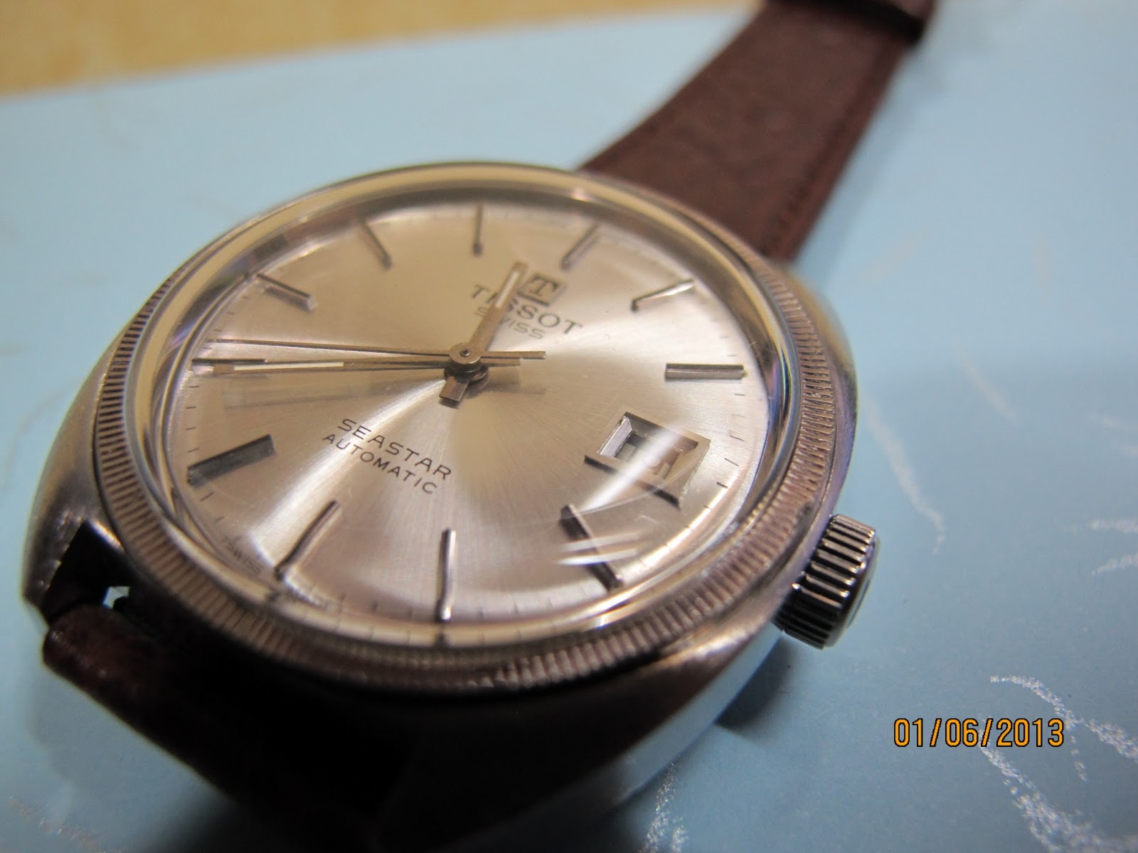 Here is a Tissot Seastar automatic from the late 1960's. The stainless steel case is solid, thick and heavy. The case is measuring at 38mm in diameter without the crown. It has a fluted bezel and an acrylic crystal. The crown is signed with a big "T" of Tissot. Inside the case is the Tissot & Fils 784-1 movement with 21 jewels and a frequency of 18,000 A/h. It has a power reserve of 45 hours. The movement was made between 1965-1968.